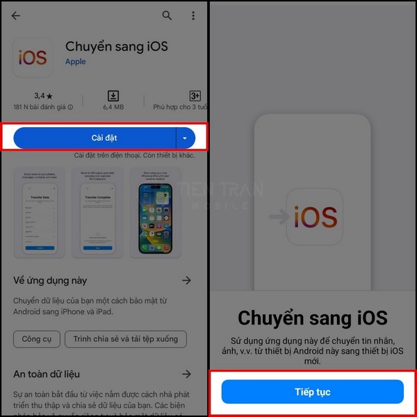 Tải ứng dụng “Move to iOS” (Chuyển sang iOS) từ cửa hàng Google Play, mở ứng dụng và cấp các quyền cần thiết. - Bước 2: Bắt đầu thiết lập iPhone