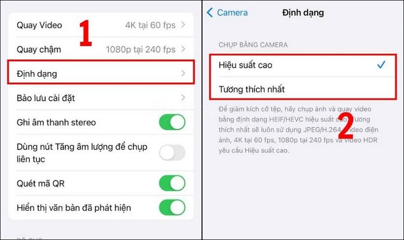 - Định dạng file: Vào Cài đặt > Camera > Định dạng: