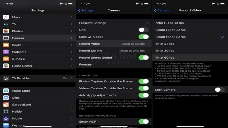 - Chọn độ phân giải: Vào Cài đặt > Camera > Quay video: