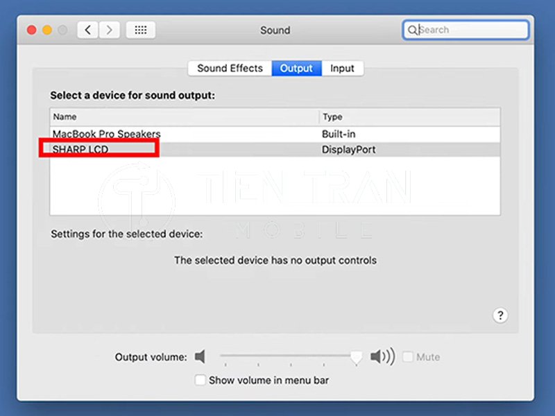 - Cách khắc phục: Vào Trung tâm điều khiển → Âm thanh (Sound), ở phần Đầu ra (Output), chọn tên tivi của bạn.