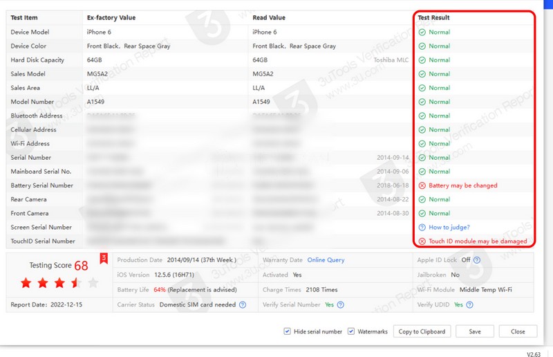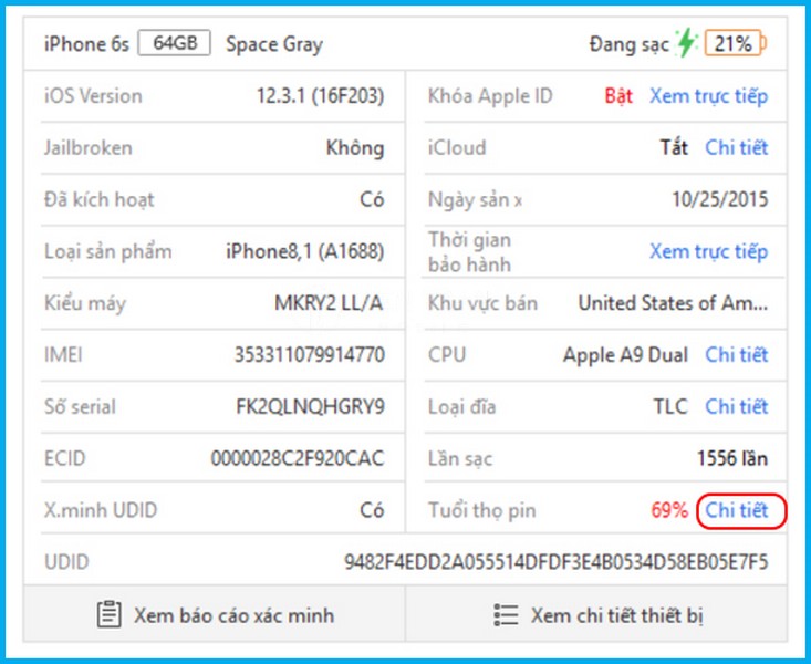 3uTools liệt kê serial của máy, serial của pin, màn hình, camera, cũng như màu sắc, mã máy (Sales Model) và khu vực bán (Sales Area). Những thông tin này giúp đối chiếu xem máy có “zin” khớp từ trong ra ngoài không.