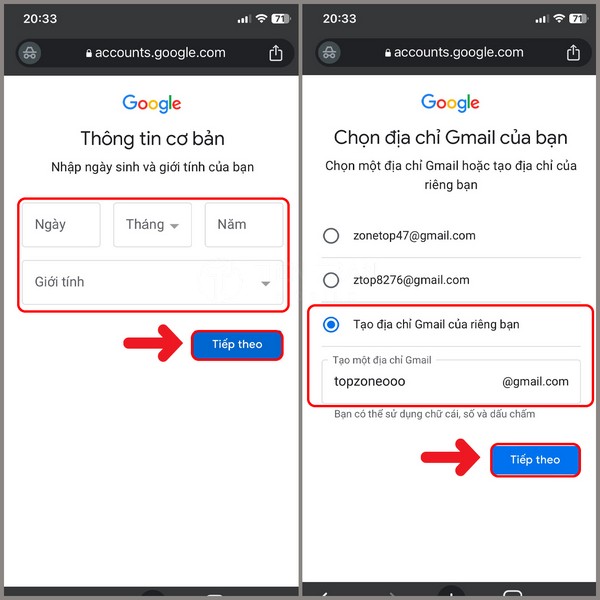 Điền đầy đủ Họ và Tên, Ngày tháng năm sinh và Giới tính. Lưu ý quan trọng: Tại Việt Nam, bạn phải từ 15 tuổi trở lên mới có thể tự quản lý tài khoản Google của mình. Hãy khai báo thông tin chính xác để tránh các vấn đề xác minh độ tuổi sau này.
