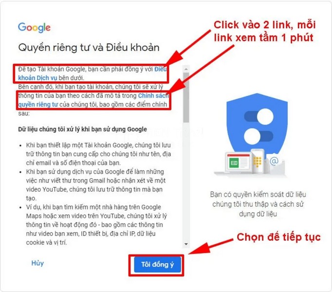Đồng ý với các điều khoản dịch vụ của Google để hoàn tất việc tạo tài khoản.