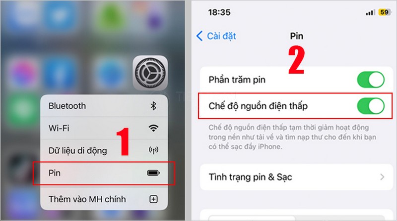 Vào Cài đặt (Settings) → Pin (Battery) → gạt bật/tắt Chế độ nguồn điện thấp (Low Power Mode).