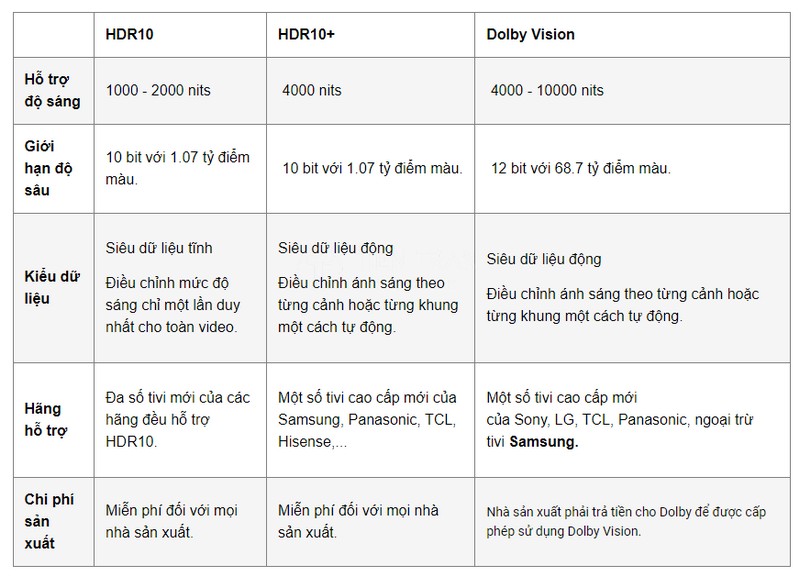 | Tiêu chí | HDR10 | HDR10+ | Dolby Vision |