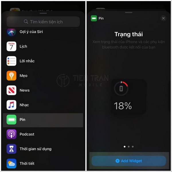 - Trên iOS: Nhấn giữ màn hình chính > dấu (+) > Tìm chọn Pin. Widget này cực kỳ hữu ích nếu bạn dùng kèm AirPods hay Apple Watch, vì nó hiển thị pin của cả các phụ kiện này.