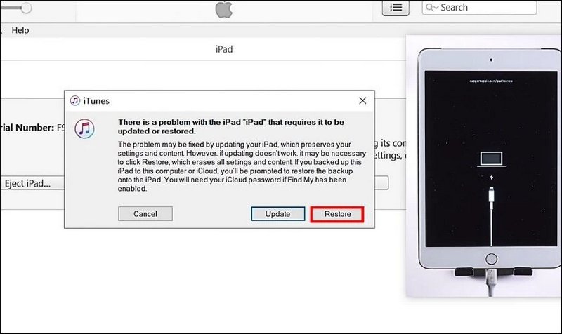 - Trên máy tính, bạn sẽ thấy một thông báo cho biết iPad đang gặp sự cố và cần được cập nhật hoặc khôi phục. Hãy chọn Restore (Khôi phục).