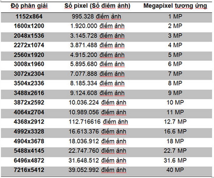 - Quy đổi: 1 Megapixel = 1.000.000 pixel.
