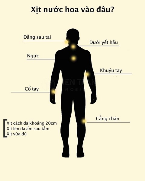 - Hoạt động nhiều/Thể thao: Sau gáy và bắp tay (giúp mùi hương bám tốt mà không bị biến đổi quá nhiều bởi mồ hôi vùng nách).