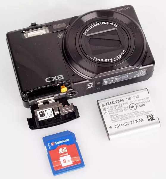 Ricoh CX6 sử dụng viên pin Lithium-Ion DB-100. Theo thông số kỹ thuật chuẩn, máy có thể chụp khoảng 260 kiểu ảnh cho mỗi lần sạc đầy. Tuy nhiên, đối với các máy cũ hiện nay trên thị trường, tuổi thọ pin có thể đã suy giảm đôi chút. Máy sử dụng thẻ nhớ chuẩn SD/SDHC/SDXC rất phổ biến, dễ dàng tìm mua và thay thế với dung lượng phù hợp (khuyến nghị sử dụng thẻ 16GB hoặc 32GB để tối ưu tốc độ đọc ghi của máy cũ).